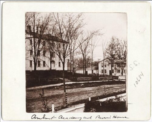Street scene with a three-story building to the left. The building is square and symmetrical, with tall, paned windows.