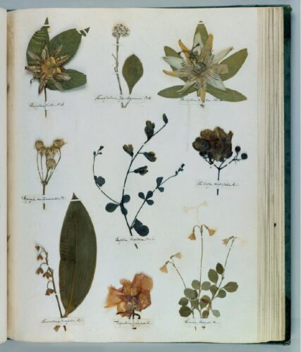 Herbarium ← Previous Next → A green book open to a page of pasted pressed flowers, each labeled with its scientific names in miniscule script.