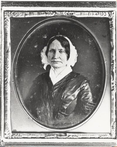 Mary Lyon ← Previous Next → Worn daguerreotype of mature woman with creased forehead in a dark, pleated dress with white ruffled bonnet.