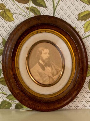 The Civil War ← Previous Next → Framed faded photograph of a bearded man in a light-colored suit. The oval wooden frame has a gold metal inner border.